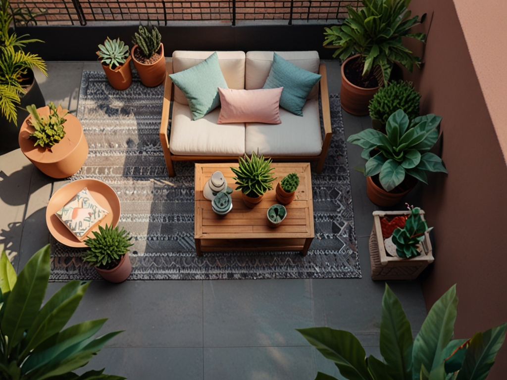 Even in a small area, designate separate zones for dining, lounging, and greenery using rugs, planters, or different flooring materials.