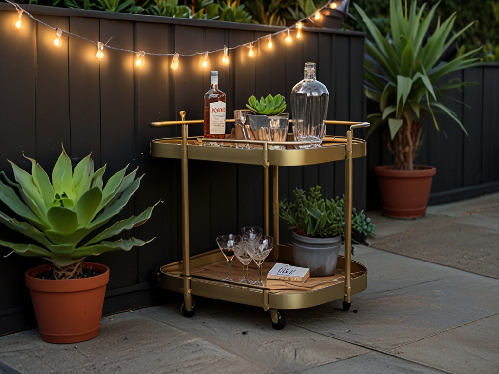 A slim bar cart tucked in a corner holds drinks and snacks while doubling as extra surface space.